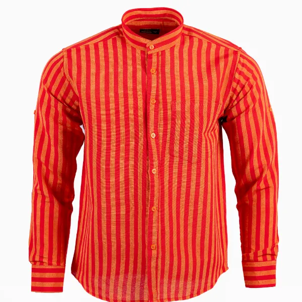 Make a memorable statement with this Mandarin Collar Full Sleeve Stripes Shirt in Dark Red, a wardrobe essential that effortlessly combines modern aesthetics with timeless elegance.