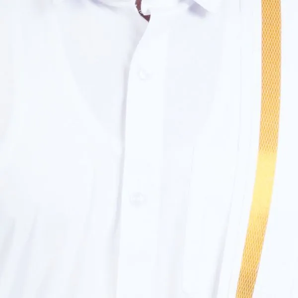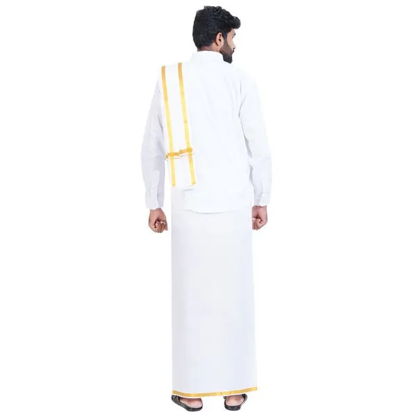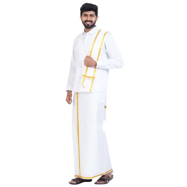 - 2.00 Mtr 30k White Dhoti: The dhoti comes with a 30k gold jari (zari) border, offering a luxurious and regal appearance. The white fabric complements the gold jari, making it suitable for weddings and grand occasions.