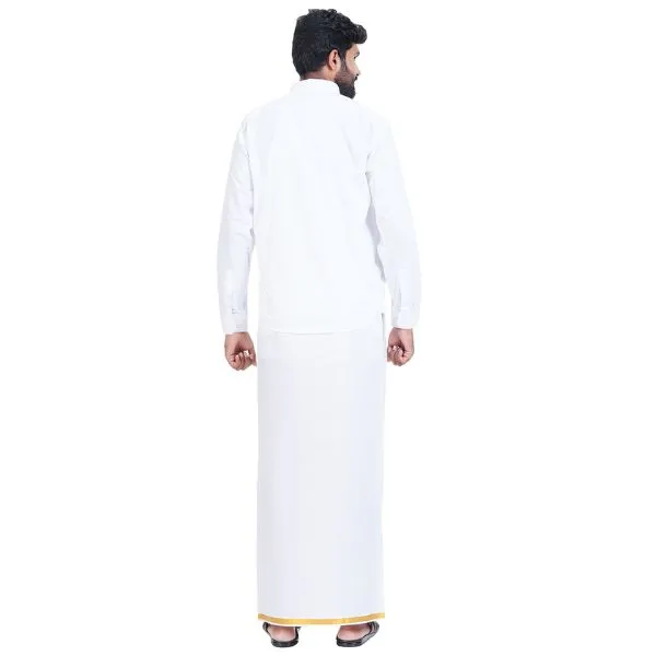 - A beautifully crafted white dhoti featuring a 30k gold jari (zari) border, adding a touch of luxury to the traditional attire.